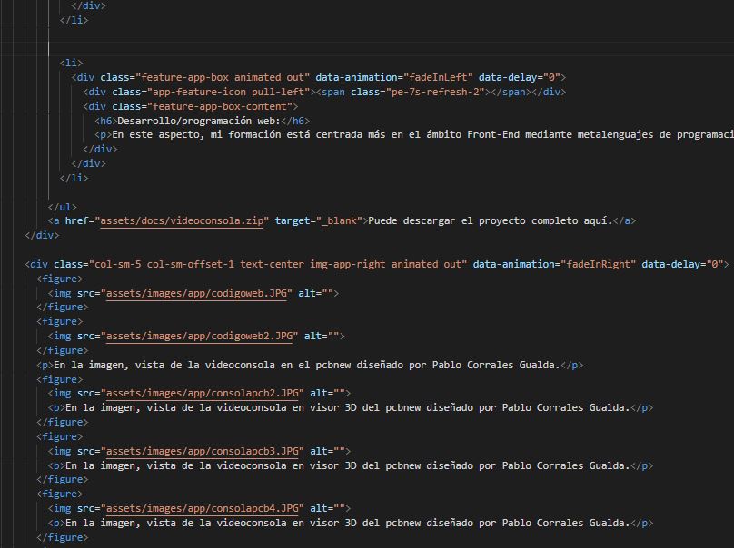 En la imagen, vista del código HTM5 de esta página web desarrollada en Visual Studio Code por Pablo Corrales Gualda.