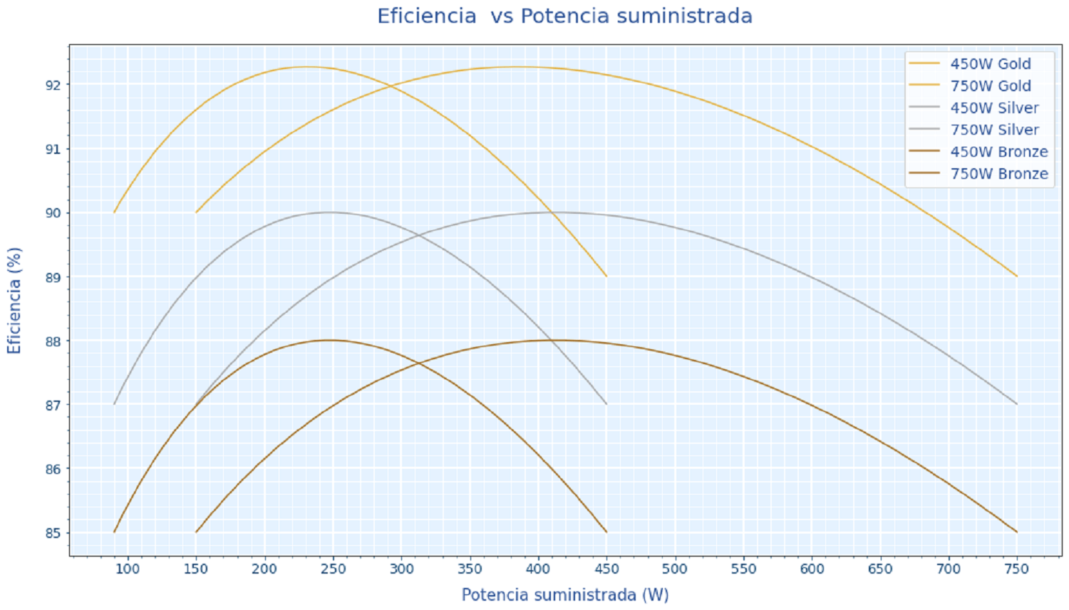 ㅤㅤA continuación, puede observar una gráfica desarrollada en Python por Pablo Corrales Gualda en la que se puede ver la eficiencia en función de la potencia suministrada de diferentes fuentes de alimentación partiendo de las diferentes clasificaciones de eficiencia existentes en el mercado: